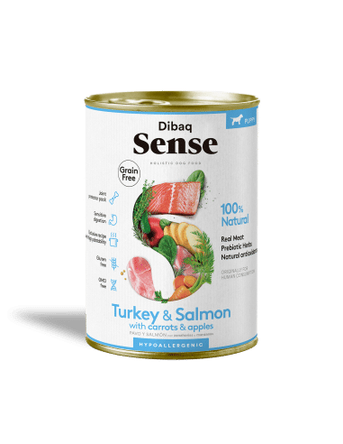 סנס שימור סלמון והודו לגורי כלבים הוא מזון רטוב פרימיום שפותח במיוחד לצרכים התזונתיים של גורים. הוא מבוסס על שילוב ייחודי של סלמון טרי (32%) והודו טרי (44%) – חלבונים איכותיים קלי עיכול, התורמים לגדילה בריאה, חיזוק השרירים ומערכת חיסון חזקה. הפורמולה נטולת הדגנים מועשרת בירקות, פירות, שמן סלמון ותוספי בריאות למפרקים, להבטחת התחלה מושלמת בחיי הגור שלך.